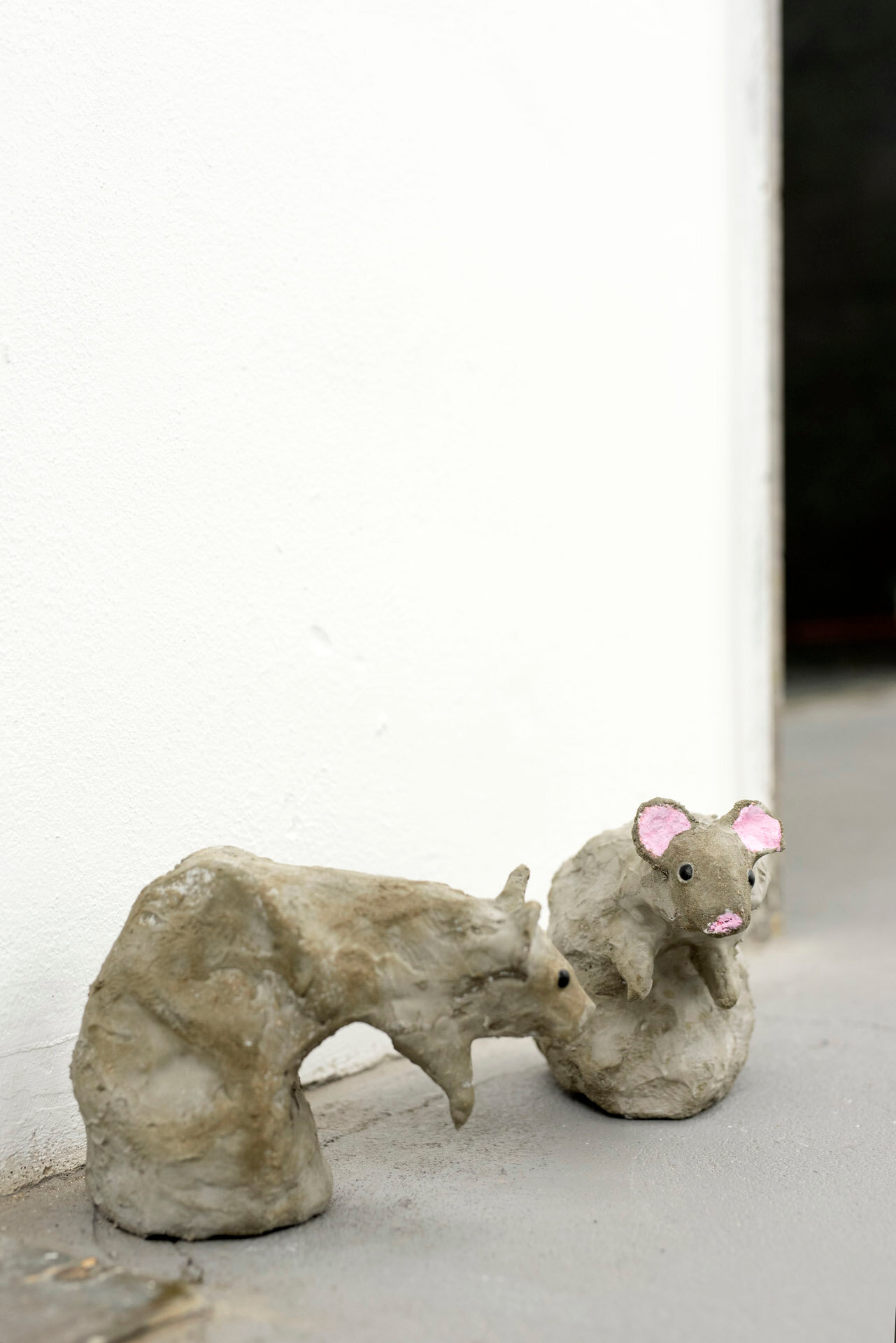 Especially during emotionally stressful periods, many people experience childhood nostalgia, the glorified memory of childhood as a golden age full of free time and uninhibited action. The sunny time of life before the responsibilities and expectations of modern adulthood mounted. A utopian place where the wolf peacefully lays with the sheep. It’s not that Fischli’s “Good Girl” is about childhood nostalgia, at least not first and foremost. But certainly the exhibition takes place in the spaces where this warm, protective fiction is nurtured. Who hasn’t built a birdhouse with their grandparents? Crafted with glitter or colored those books where fox and cat alike stare drolly at the chick instead of tearing it apart? Gina Fischli’s supposedly innocent and authentic aesthetic repeatedly refers to this nest warmth, without indulging in it or positioning itself ironically.