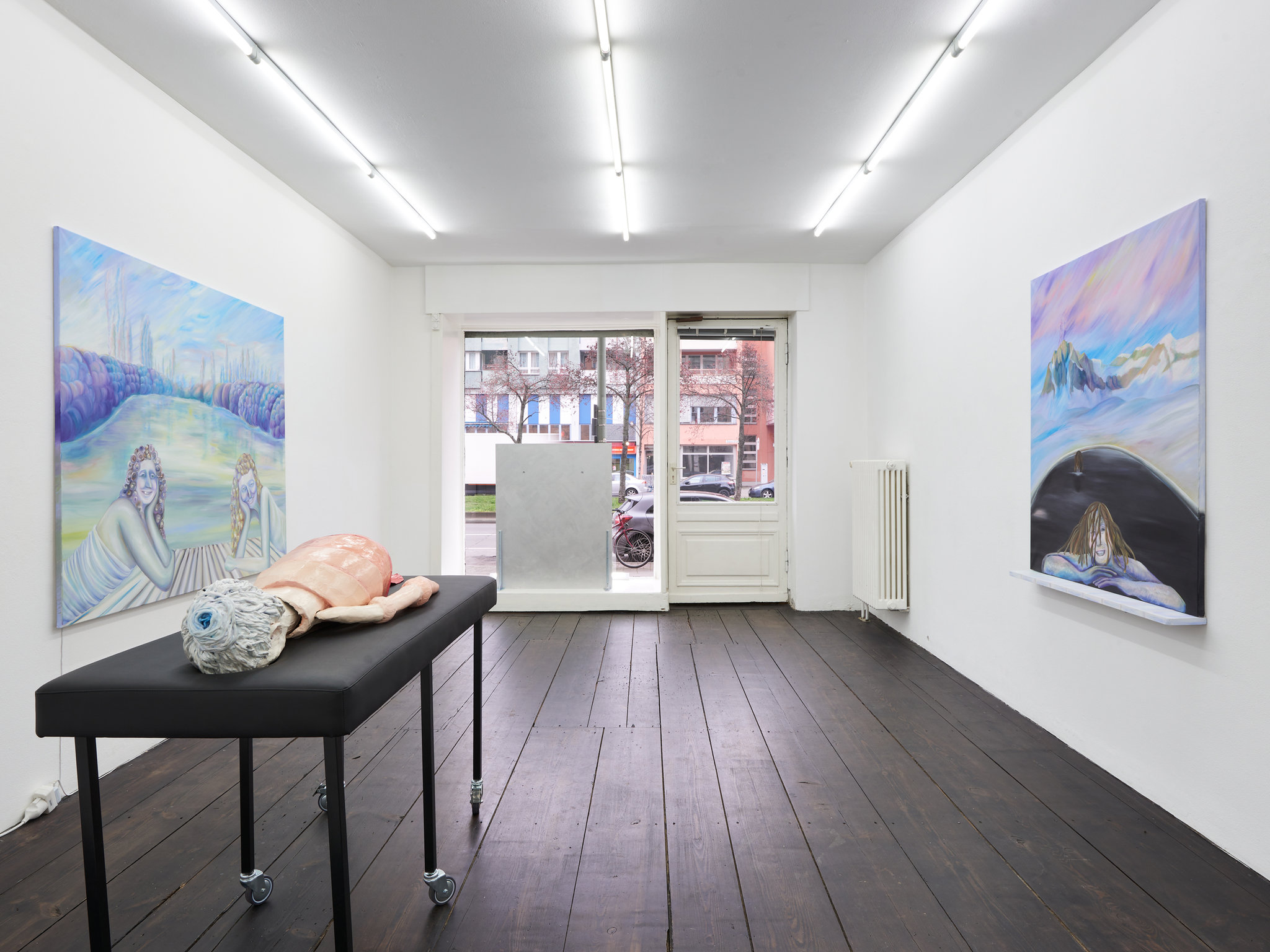 SANDY BROWN is delighted to present Happy Yellowing by Beatrice Marchi. This is the artist’s first solo exhibition in Berlin. The cycle of Loredana started in 2016 as a hermeneutic avatar of the artist’s own existential gasses, and is hereby introduced by Marchi in its latest emission. We encounter the character of Loredana in a morbid, yet vividly syncopated TV set a la Sunset Boulevard: she lies face down on a customized, black leather, massage bed. Her body seems to have nicely consolidated into a hard, baby scampi carapace. Whether she has just passed away, or is simply out after a long therapeutic session, we don´t know. The backdrop is an enigmatic amarcord sequence painted on different supports: in Ninfeeee, 2020, (acrylic and oil on canvas, led light) and I love Segantini (with J-Lo), 2020, (acrylic, pastel and oil on canvas and wood), the character of Loredana and multiples of hers are portrayed in a variety of labored poses, in proximity of a pool. Time and colors are bound to morphing and Marchi investigates their mutual unfolding.
